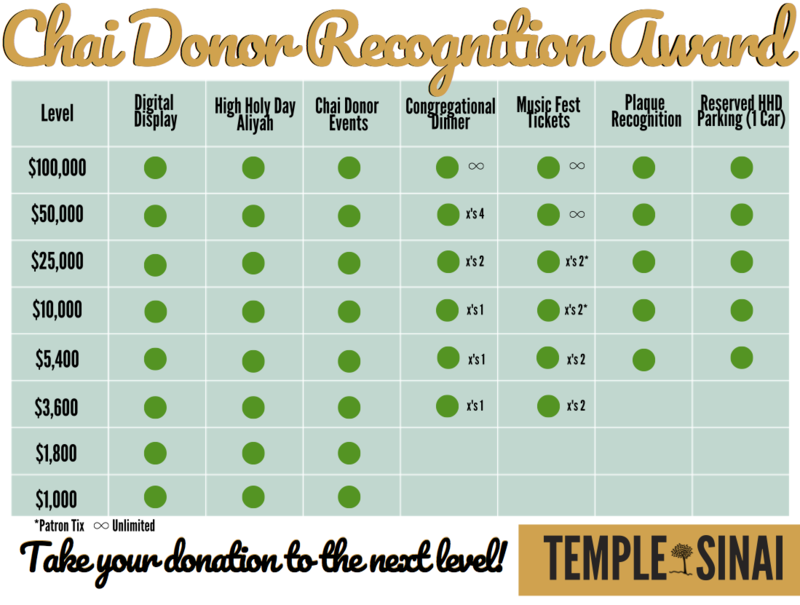 Chai Donors are those in our congregation who donate $1000 or more above their partnership commitment (dues). All donations cumulatively made during a given fiscal year (July 1-June 30) determine your Chai Donor category for the following year.